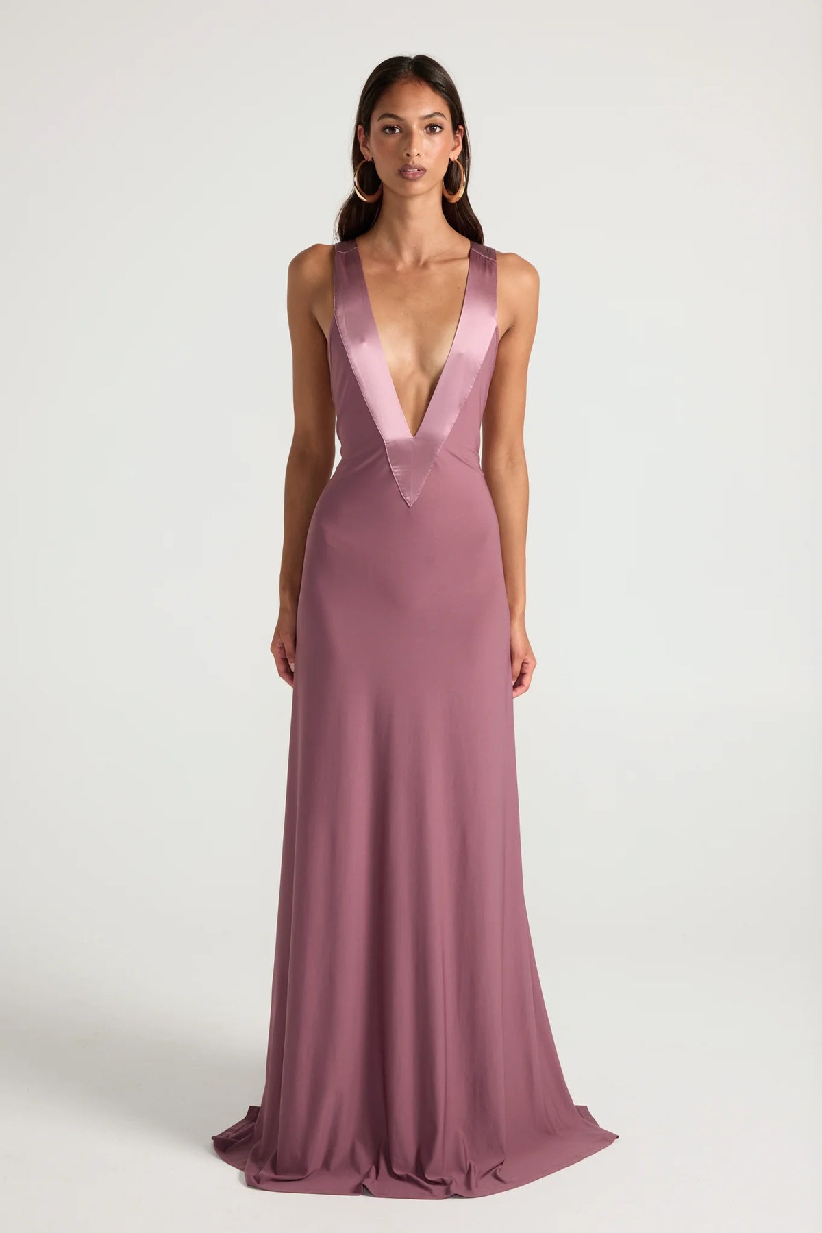 This elegant gown features both a plunged neckline and low back accentuated with silk trim detailing. The soft jersey fabric drapes to hug the body and trains behind you in length.