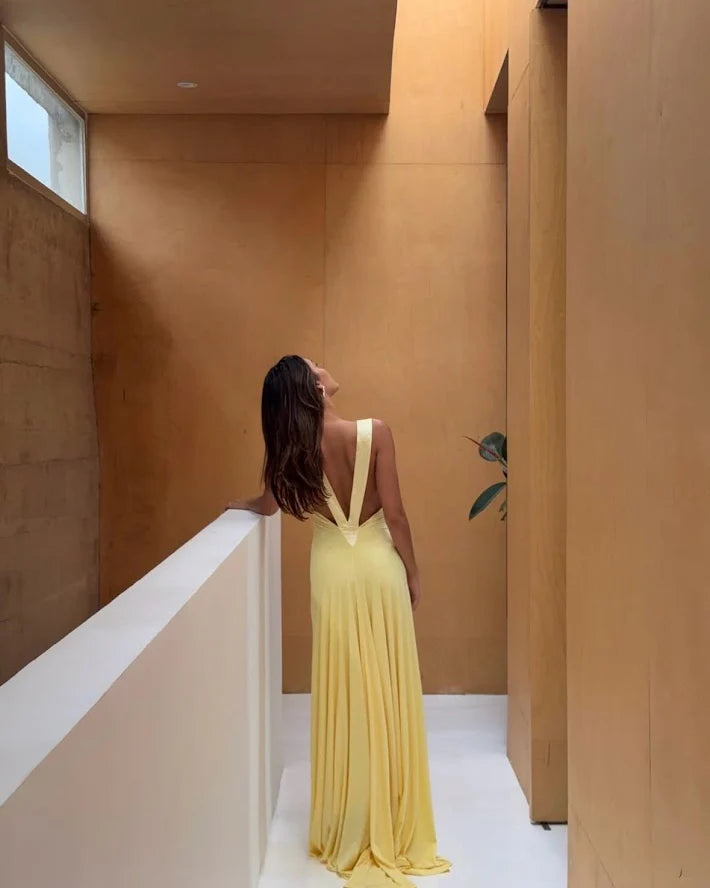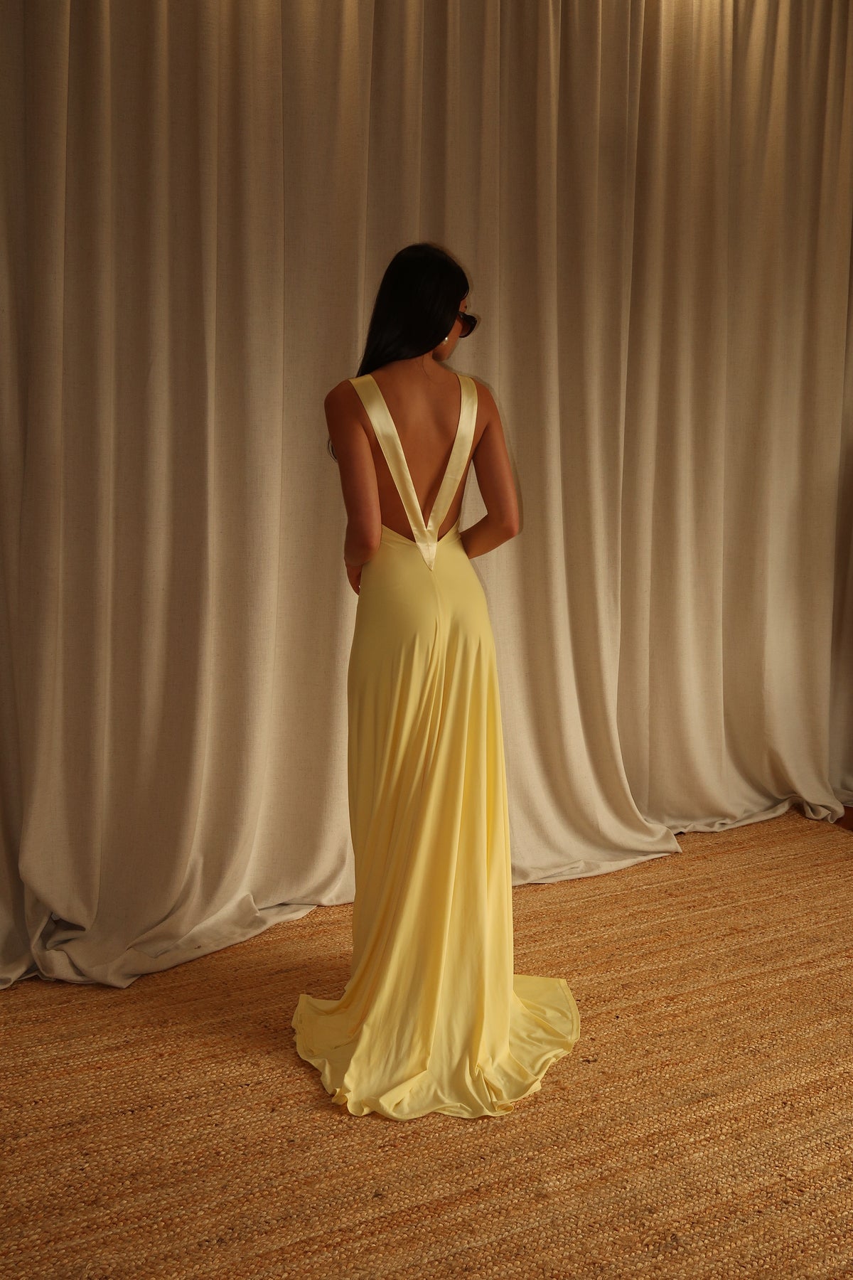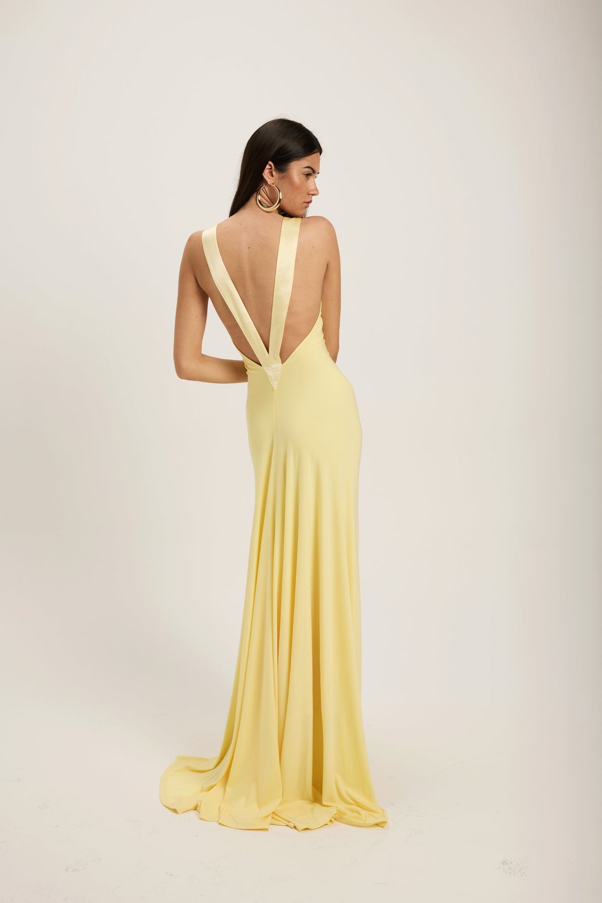 This elegant gown features both a plunged neckline and low back accentuated with silk trim detailing. The soft jersey fabric drapes to hug the body and trains behind you in length.