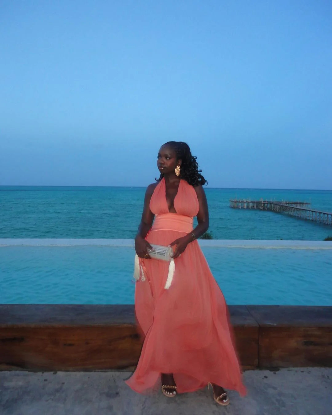 Introducing Serena, a striking fusion of femininity and elegance. Designed in a lustrous Coral hue, she radiates a warm and earthy charm. Serena features a flattering drop-waistband crafted from a quality viscose. Her graceful georgette drape cascades over the bust and flows from the hips. Fasten her sensual halter neckline securely around your neck, and let the ties gracefully trail down the open back. Lined to complete.