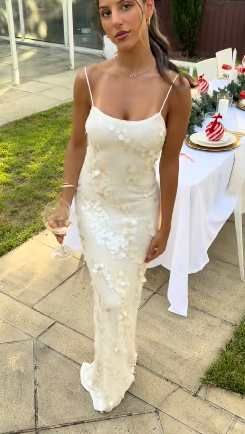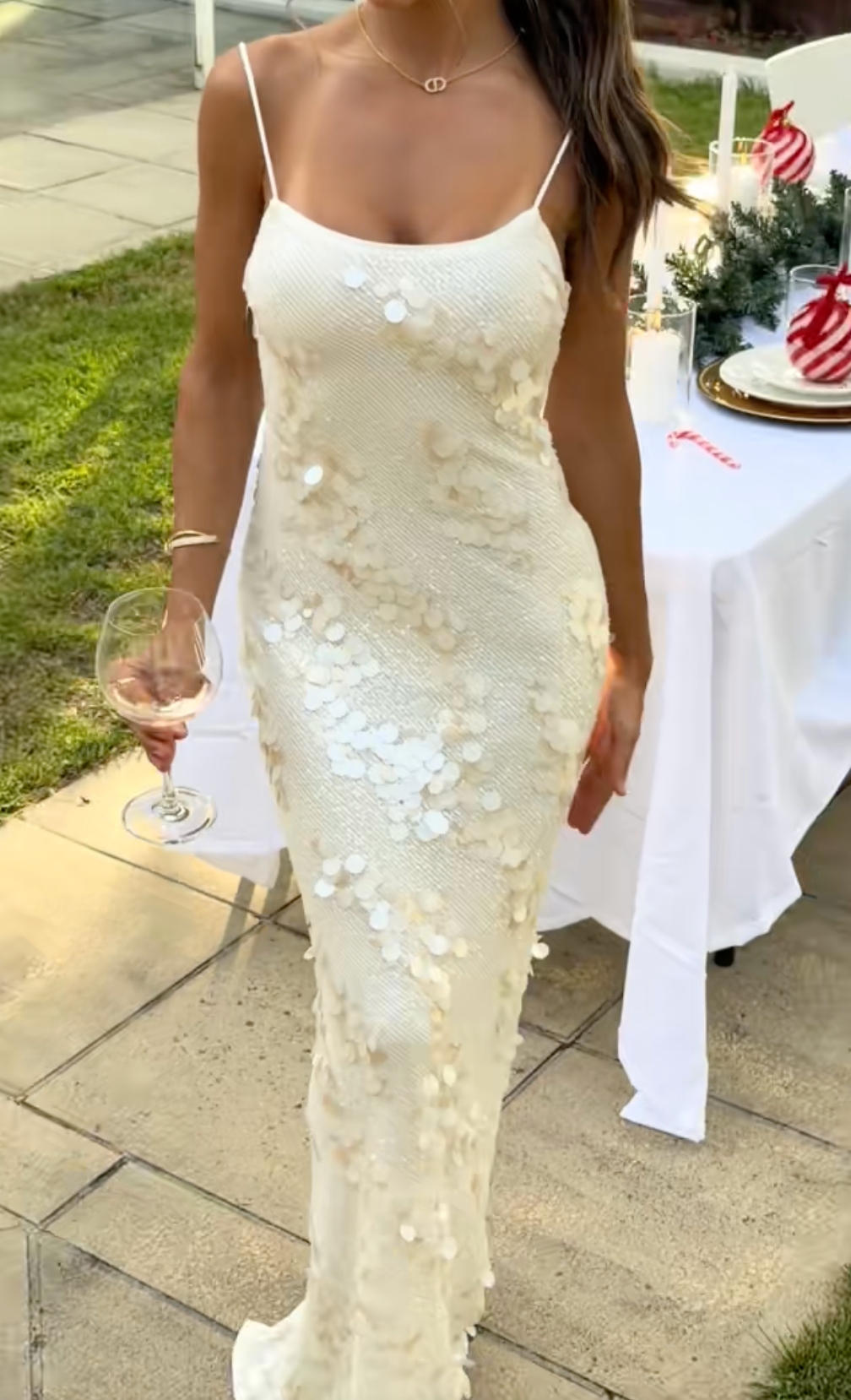 Crafted from mesh and adorned with delicately scattered sequins, the Devina Sequin Dress catches light with every movement. Suspended from fine straps, the gown features a contoured bodice and fluid drape that skims the body with elegance and comfort.