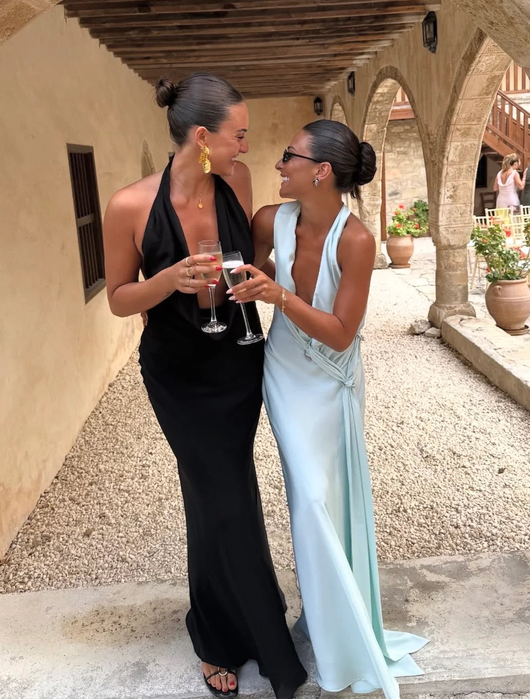 • A unique blend of metal hardware and delicate satin fabrication. Finished with three rings on the hip, fixing two waterfall sashes that cascade down the garment. Featuring an asymmetric back and plunge neckline.